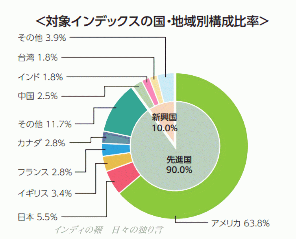 全世界とはいいますが、比率を見ると、全体の6割強を米国株が占めています。