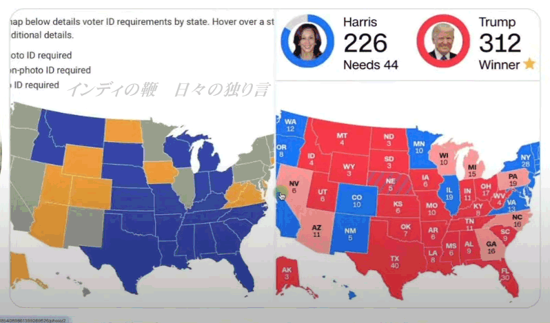 左のマップでグレーの部分が、IDを廃止した州です。そして、右のマップで青の部分が、ハリス氏が獲得した州です。奇妙なほど一致しているとは思いませんか?