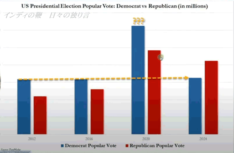 それであっても、接戦州のペンシルベニア州では、ハリス候補が勝てないと考えたからでしょう、10万票ほどの不正と思われる投票用紙はいっていると思われる箱が、民主党関係者によって投票所に運び込まれるようなことが起きたと本動画の中で触れています。