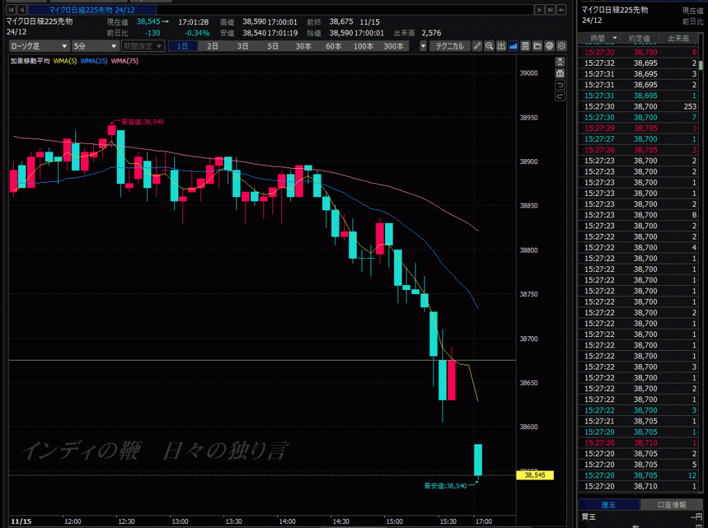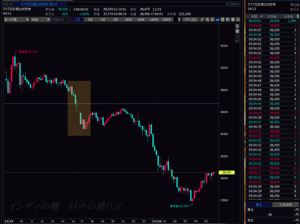 そしてもしも、38700円で買いの注文が約定(やくじょう)していたら、そのあとに反発がなかったわけですから、夜間立会が窓を開けて下落したところから始まり、損失だけが拡大してしまったことになります。