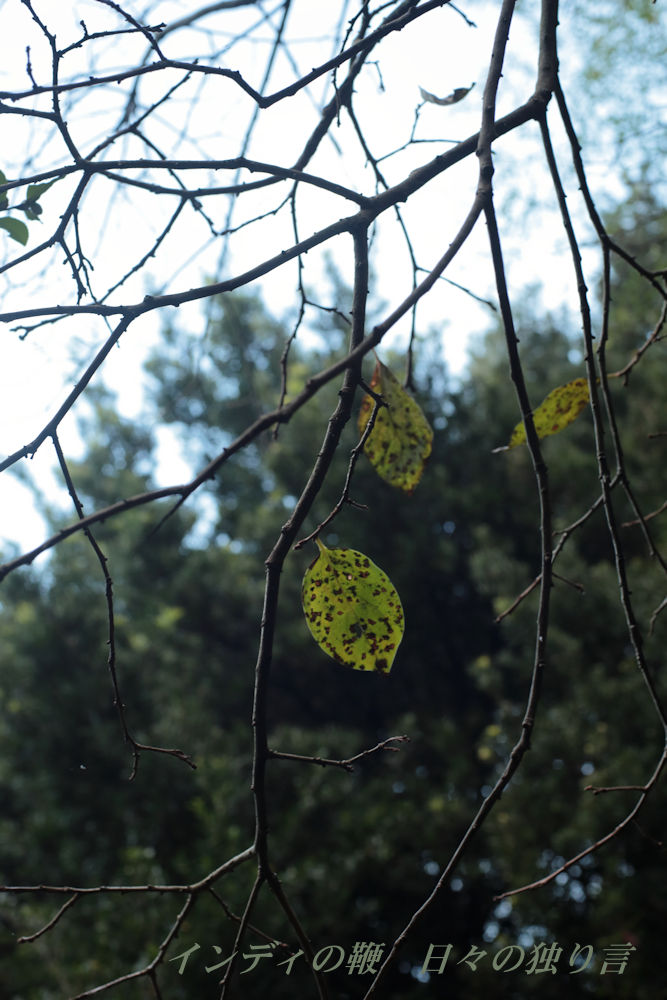 今朝も私は、実が落ちて、葉が数枚残った柿の枝を、下から見上げるようにして撮りました。その時のF値はf/4です。このF値でも、枝と葉以外の背景はボケています。