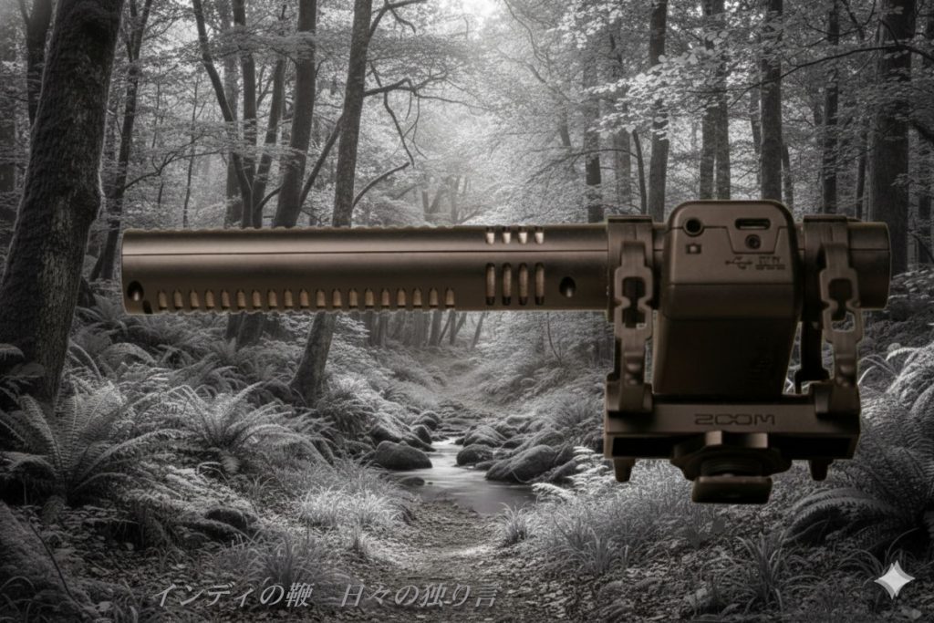 フェードインで環境音が聞こえ始める。視聴者を世界観に引き込みます。 2. 機材登場 (0:05-0:10) [ご提示いただいたM3 MicTrakの画像] または、カメラに装着されたM3のアップ。 「私が自然の音を切り取るためのパートナー、ZOOM M3 MicTrakです。」(ナレーションまたはテロップ) 機材の質感を見せます。 3. 収録風景 (0:10-0:20) 実際にあなたが森でマイクを向けている様子(横顔や背中越し)。風防(ウィンドスクリーン)が揺れている様子など。 実際の録音データを使用