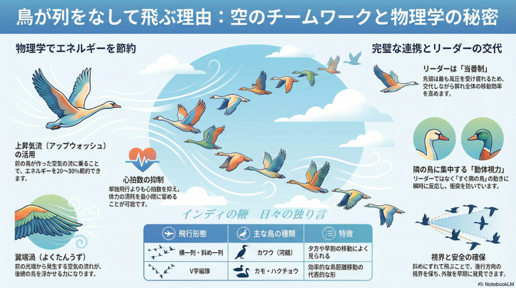 あの整然とした飛行は、単なる偶然や仲良しだからという理由だけではなく、「空気力学(物理学)」と「鳥の優れた能力」に基づいた、非常に理にかなった行動です。