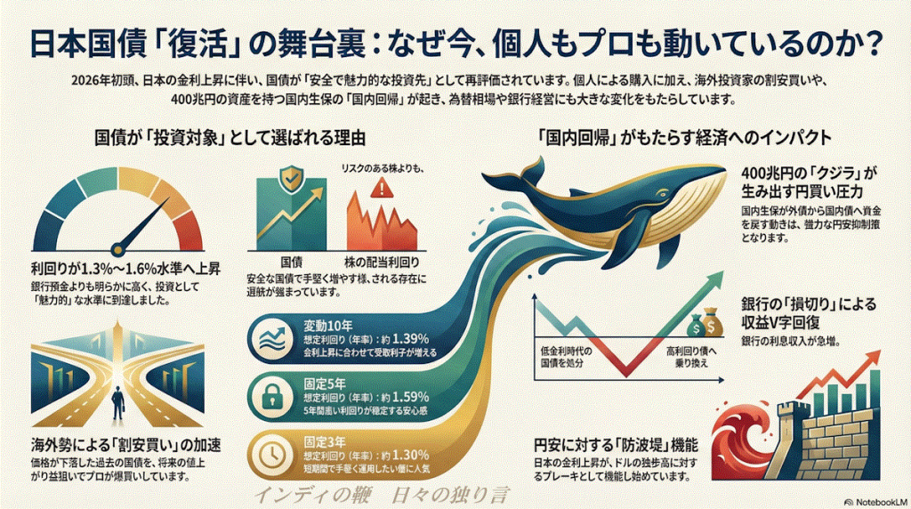 - 「国内回帰」のメリット: それに比べて、日本国債なら為替リスクはゼロ、ヘッジコストも不要です。 日本の金利が1.5%〜2%程度あれば、「コストを差し引いた後の米国債」よりも実質的な利回りが良くなるため、「無理して外国に行かず、日本国債(しかも銀行が売って安くなっているもの)を買おう」という判断になります。