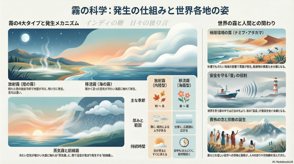- 明け方の条件: 地面付近の空気が急激に冷やされることで、空気が抱えきれなくなった水蒸気が細かい水滴(霧)に変わります。
