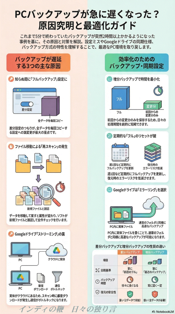 バックアップにおける差分と増分の違いを、GoogleのAI Geminiにまとめてもらいました。